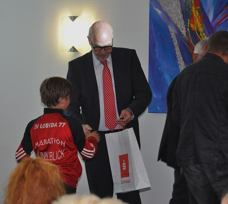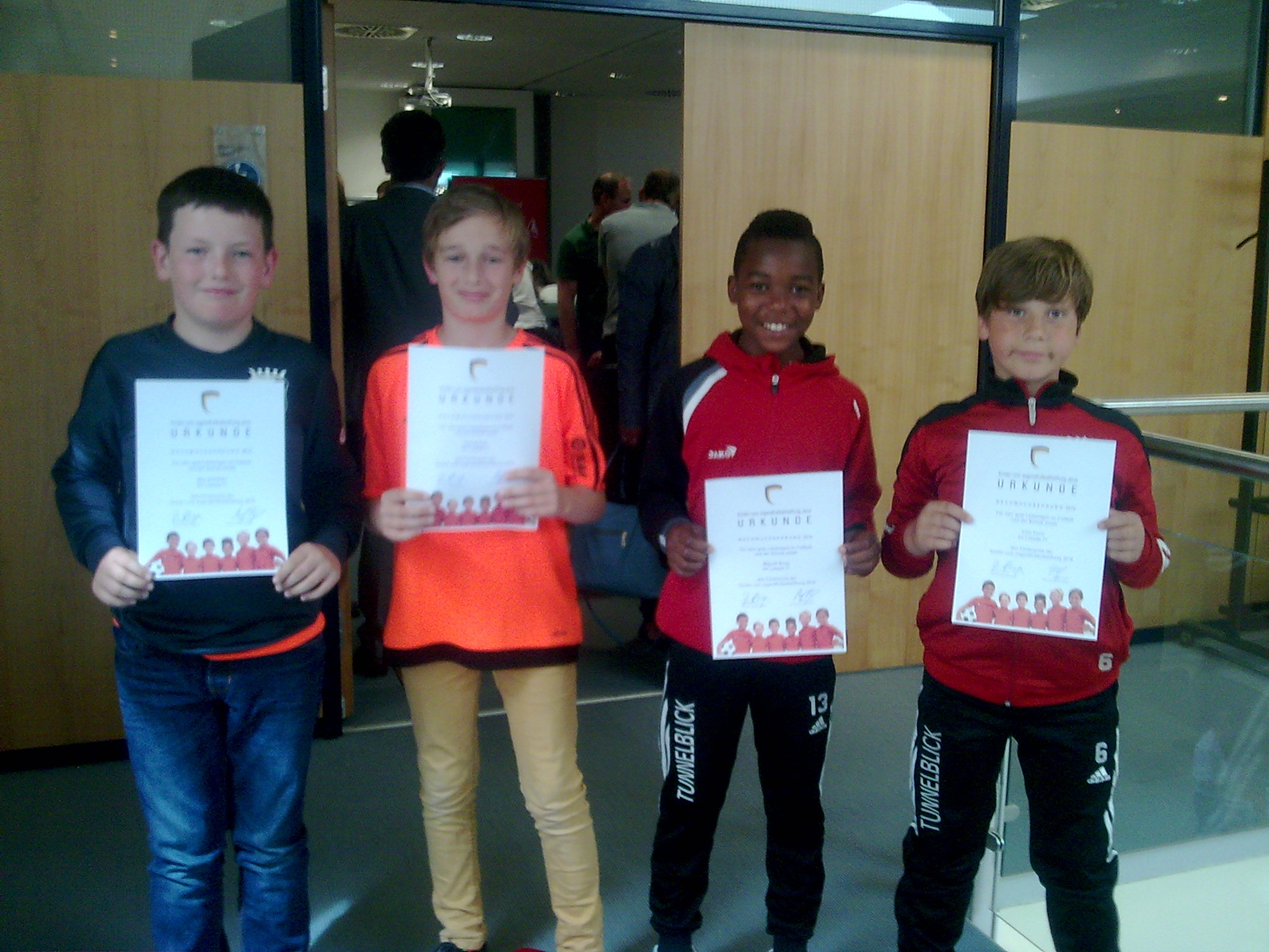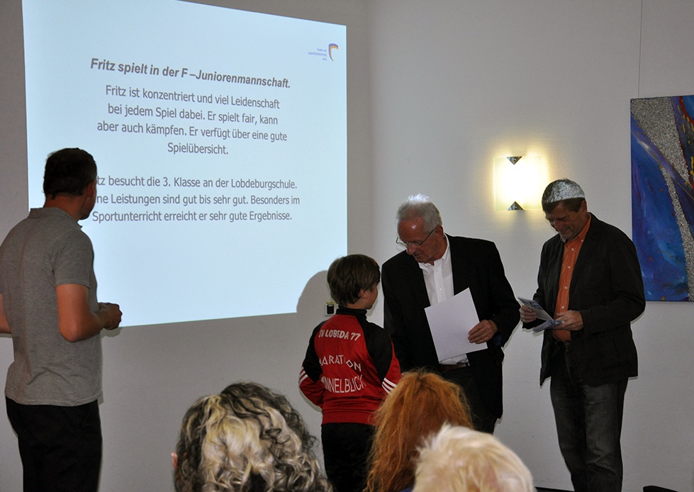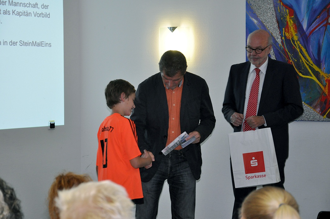 Mit der Begrüßung durch Herrn Beyer, Vorstand der Stiftung, bedankte er sich für die großzügige Unterstützung durch die Sparkasse zur Vorbereitung und Durchführung dieser Ehrung. Der Dank ging an Herr Erhard Bückemeier, Vorstandsvorsitzender, Nicole Kappitz, Unternehmenskommunikation und Praktikantin Mariele Haferland. Herr Beyer berichtete über die Projekte der Kinder- und Jugendfußballstiftung der Trainerweiterbildung, Unterstützung der Trainerausbildung, Unterstützung für Trainingslager, der heutigen Nachwuchsehrung, der vielen organisierten Fußball AG's und dem 4. Internationalen Fußballturnier - das ebenfalls von der Sparkasse unterstützt wird.