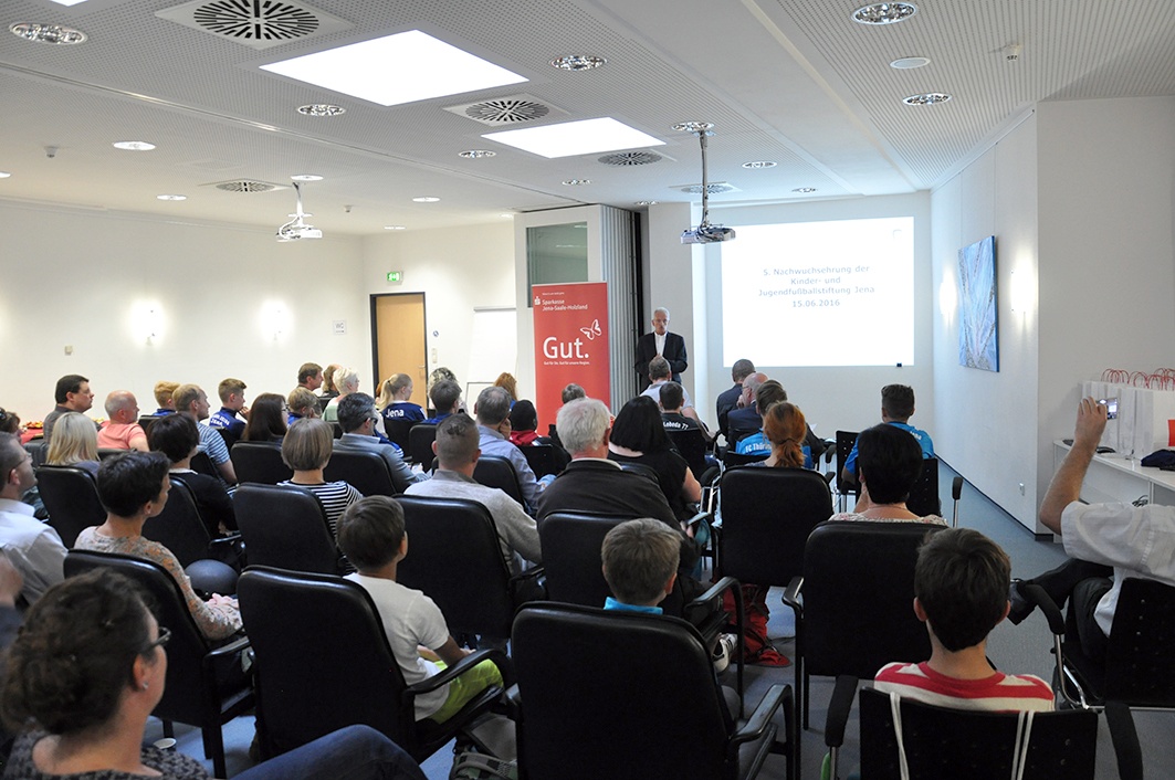 Am Mittwoch, dem 15.06.2016 trafen sich 19 Mädchen und Jungs von den Vereinen SV Lobeda 77 e.V. , FV Thüringen e.V., FF USV Jena e.V. und FC Carl Zeiss Jena e.V. mit Ihren Eltern, Betreuern , Trainern, Verantwortlichen der Vereine, u. a. Herr Falk Buchmann, Präsident FF USV Jena e.V. im Sparkassenhauptgebäude zur alljährlichen Nachwuchsehrung.