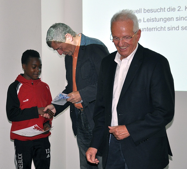 Sodann ergriff Herr Bückemeier das Wort, lobte diese Veranstaltung für die Nachhaltigkeit. Sport und Bildung, guter Fußball und gute Zensuren sind Voraussetzungen für die Zukunft. Er wünschte allen Auszuzeichnenden alles Gute und lobte das Vorbild in Schule, Sport und Verein. Herr Stefan Treitl, Vorstand der Stiftung, hält die Laudatio.