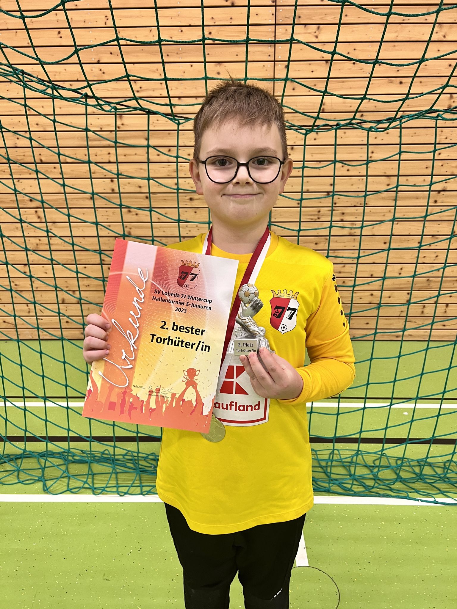 Wir haben unser 1. SV Lobeda 77 Wintercup Turnier E-Junioren am 14.01.2022 ausgetragen. In den Gruppenphasen haben sich unsere beiden Mannschaften des SV Lobeda 77 E1 Souverän in der Gruppe A mit Platz 1 und des SV Lobeda Gruppe B mit Platz 2 Qualifiziert. Was zur folge hatte, dass unsere beiden Mannschaften im Halbfinale aufeinander trafen. Es war ein Kampf um jeden Centimeter und auf Augenhöhe. Glücklicherweise durch ein Tor, hat sich der SV Lobeda 77 für das Finale Qualifiziert. Unsere SV Lobeda 77 E1 wollte sich zumindest nach der enttäuschenden Niederlage im Halbfinale den 3. Platz sichern. Durch eine Super Leistung krönte sich unsere SV Lobeda 77 E1 Mannschaft mit einem Sieg gegen Chemie Kahla mit 3:0 den 3. Platz. Im Finale hatte unser SV Lobeda 77 von beginn an gezeigt wer Gewinnen will. Durch 2 herausragende Leistungen konnte Emil Stephaniedis gleich 2 Tore erzielen, was die Führung für unsere Mannschaft bedeutete. In der letzten Minute setze Konstantin Zsilko mit einem Super Dribling das 3:0 den Schlusspunkt in ein spannendes Finale. Der SV Lobeda 77 Gewinnt das Finale mit 3:0 gegen TSV Pölzig. Auch unser Torwart Phil Louis Haubold hat durch seine Super Leistung im gesamten Turnier nur ein Tor zugelassen und somit einen Pokal erhalten für den 2. besten Torwart. Unsere beiden Trainer Stephan Wich (Co Trainer) und Lukas Trommer (Sportstudent im Praktikum) haben einen Super Job gemacht.
